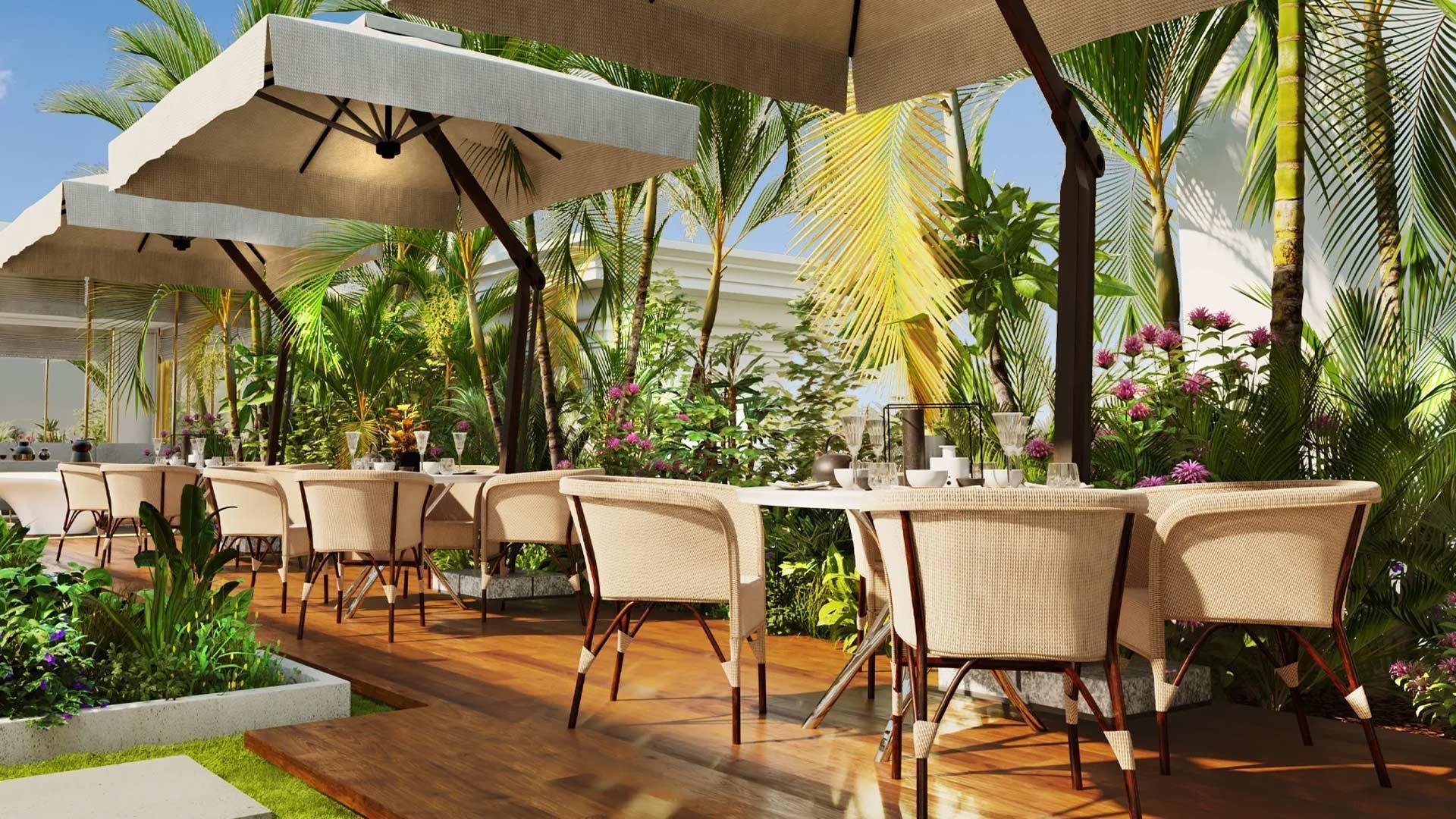 - a green open-air garden with tables and awnings.